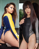 FEATURES: Ganzkörper-Badeanzug-Catsuit, hochgeschlossen mit kleinem Kragen und komplett bedecktem Rücken, 4/4 lange Arme und Beine. Die Nähte deuten einen hohen Beinausschnitt und String an.